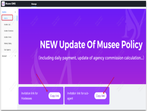 Go to “Home” page to get an invite link and share the hosts(all hosts download from your link will register in your agency automatically. in hollah